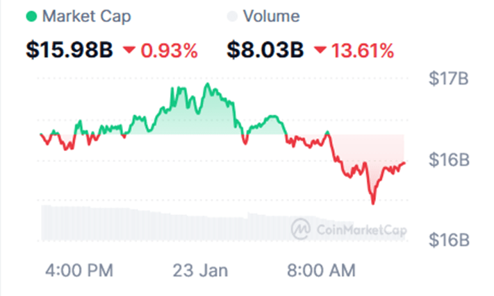 加密市場下降了0.94%,至3.01萬億美元,而交易量崩潰了21.10%,至102.57億美元。CMC恐懼與貪婪指數爲34(恐懼),因爲交易者在美聯儲1月27日至28日的政策會議前減少了槓桿。