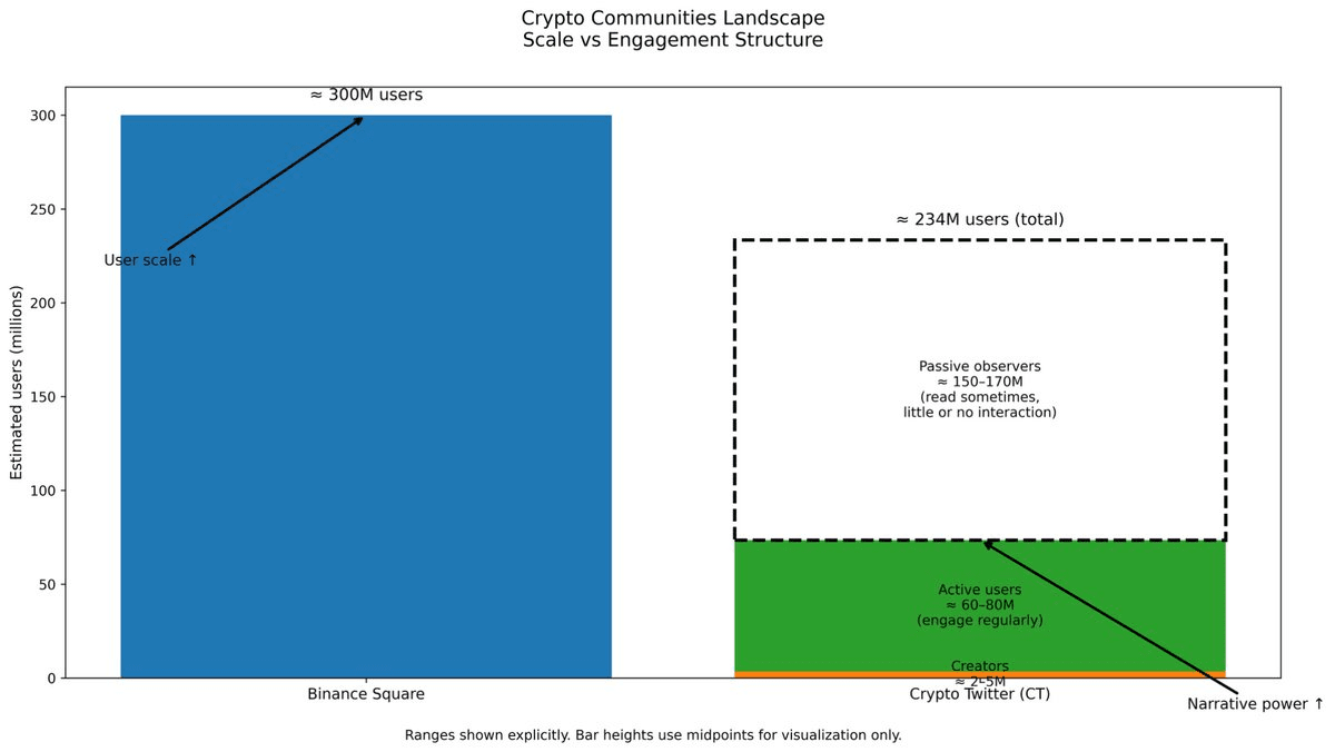 將此與加密 Twitter (CT) 進行比較,CT 的最大理論用戶量估計爲 2.34 億,只有 6,000 萬至 8,000 萬人定期參與,活躍創作者只有 200 萬至 600 萬。雖然 CT 仍然是加密文化和情緒的主要影響領域,但 Square 在一個完全以加密貨幣需求和動態爲中心的環境中集中了一大用戶基礎。