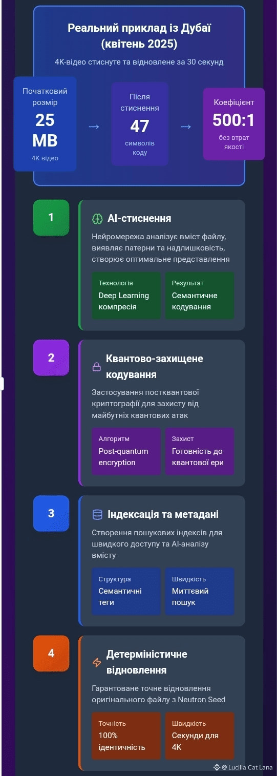 Саме так працює Neutron — технологія стиснення, яка перетворює 25-мегабайтне відео у 47-символьний код і зберігає його повністю он-чейн. На практиці це означає стиснення до 500:1 без втрати якості, причому файл не просто лежить мертвим вантажем, а перетворюється на "Neutron Seed" — розумний об'єкт, який можна запитувати природною мовою. Коли у квітні на конференції в Дубаї команда продемонструвала це наживо, стиснувши та відновивши 4K-відео за 30 секунд прямо в транзакції, навіть досвідчені розробники були вражені.