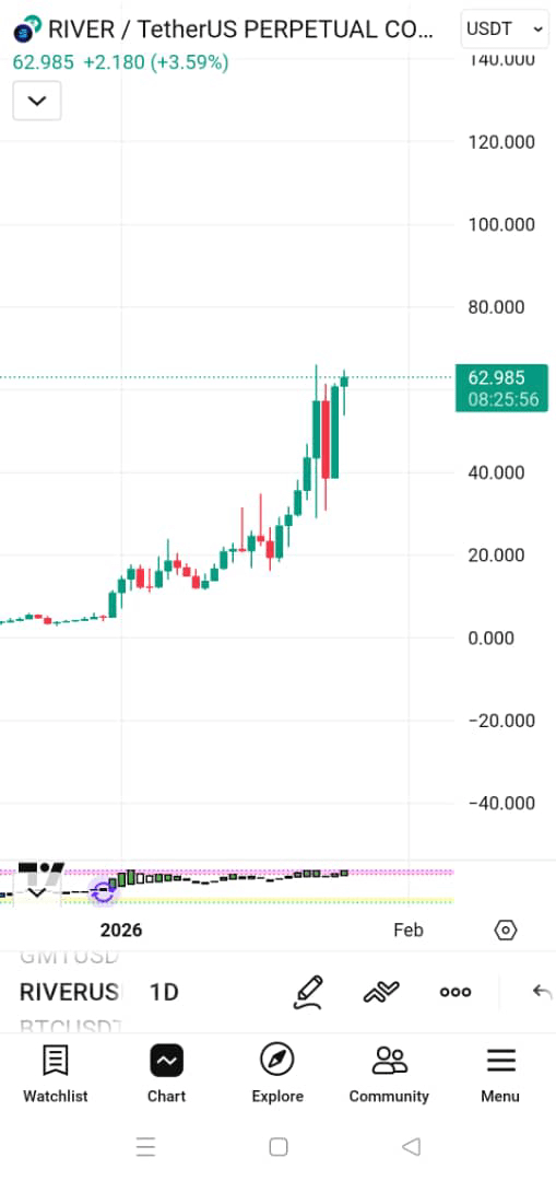 首先跳出來的事情是:價格強勁,毫無疑問。$RIVER 交易在62.9附近,上漲超過+3.5%,而這個水平之前的結構已經講述了一個故事。