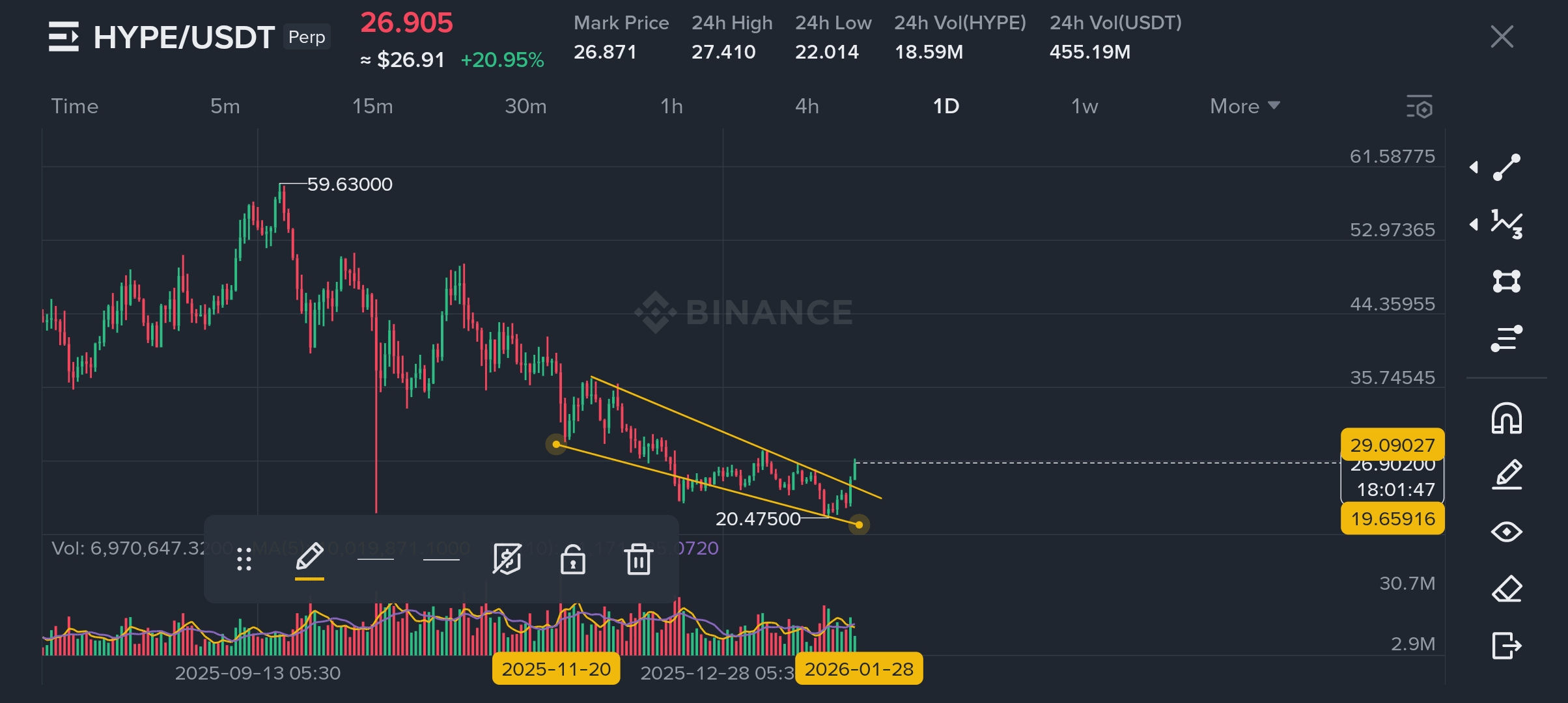 HYPE/USDT 圖表顯示出一個明顯的下降三角形模式,價格在 $26.95 附近,表明在高點下降的情況下,價格測試下行趨勢線,信號爲看跌延續。當前市場數據顯示 HYPE 的交易價格接近 $25-47(來源不同),最近的波動包含 12.96% 的 24 小時漲幅,但技術指標中性。