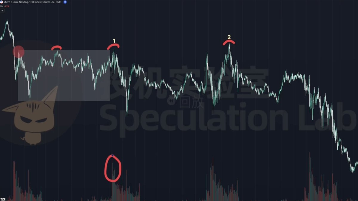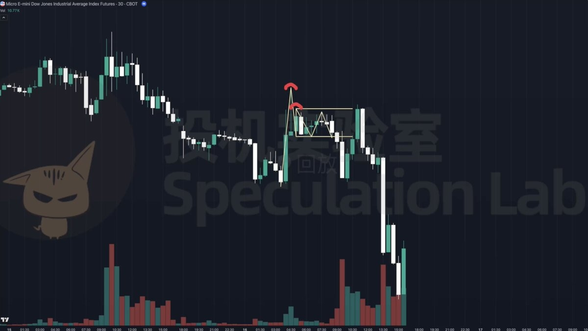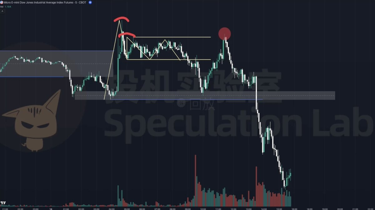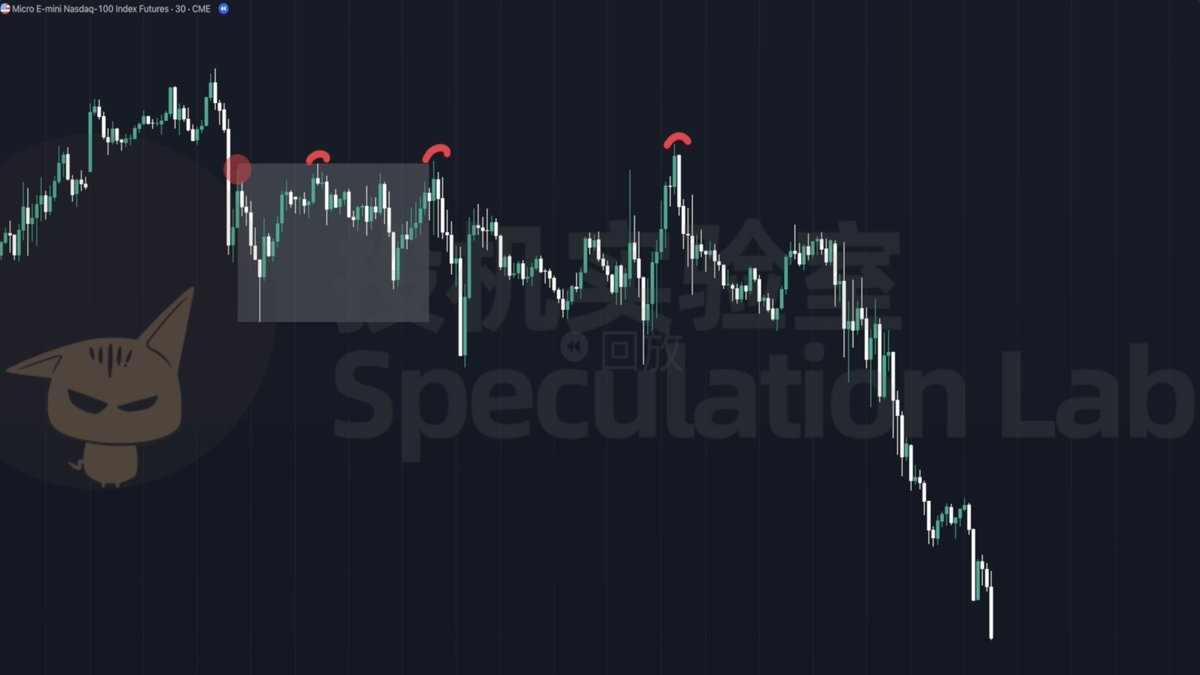 看一個例子,這是微道指期貨 MYM。在交易日開盤的時候,我們先打開 30 分鐘圖表,如果價格形成了一組等高點,也就是多個高點幾乎處在同一水平或斜率,這通常表明上方積累了買方的流動性,這就可以標記爲理想的做空區間。可以看到,在紐約時間開盤之前,價格已經開始了一波上漲,並形成了一個擺動高點,價格在這個高點附近衝高回落,這就是這個高點被市場尊重的表現。價格並沒有能有效突破,這個高點就成爲了一個關鍵位置。
