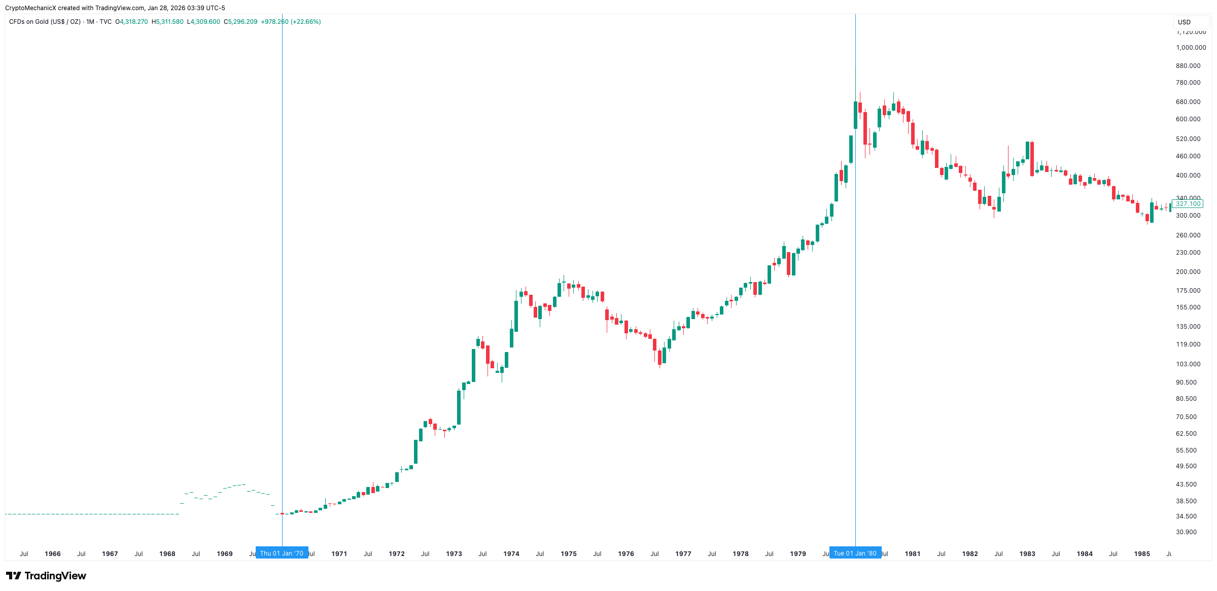 這個循環始於美國放棄金本位制,通脹恐懼爆炸。對紙幣的信任減弱,黃金成為終極安全避風港。