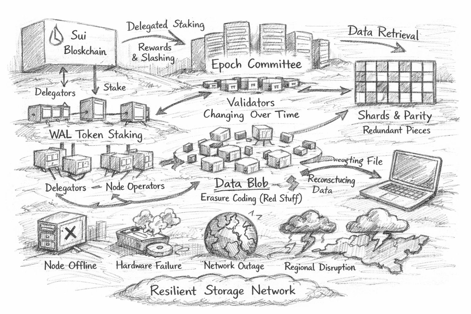 這就是存儲系統中的“共識”需要仔細用詞的地方。當人們聽到 dPoS 時,他們通常想象區塊生產和最終性。在 Walrus 中,實際角色更接近於選擇和確保必須證明他們存儲數據的操作員集合,然後圍繞這種義務執行激勵。dPoS 層在進行 Sybil 抵抗和問責:它使得便宜地生成虛假容量變得困難,並在操作員失敗時爲網絡提供可信的懲罰槓桿。Walrus 自己的描述強調對誠實參與的獎勵和對未能履行存儲義務的削減式懲罰,這是如果你希望開發者將“可用性”視爲不僅僅是營銷的經濟支柱。