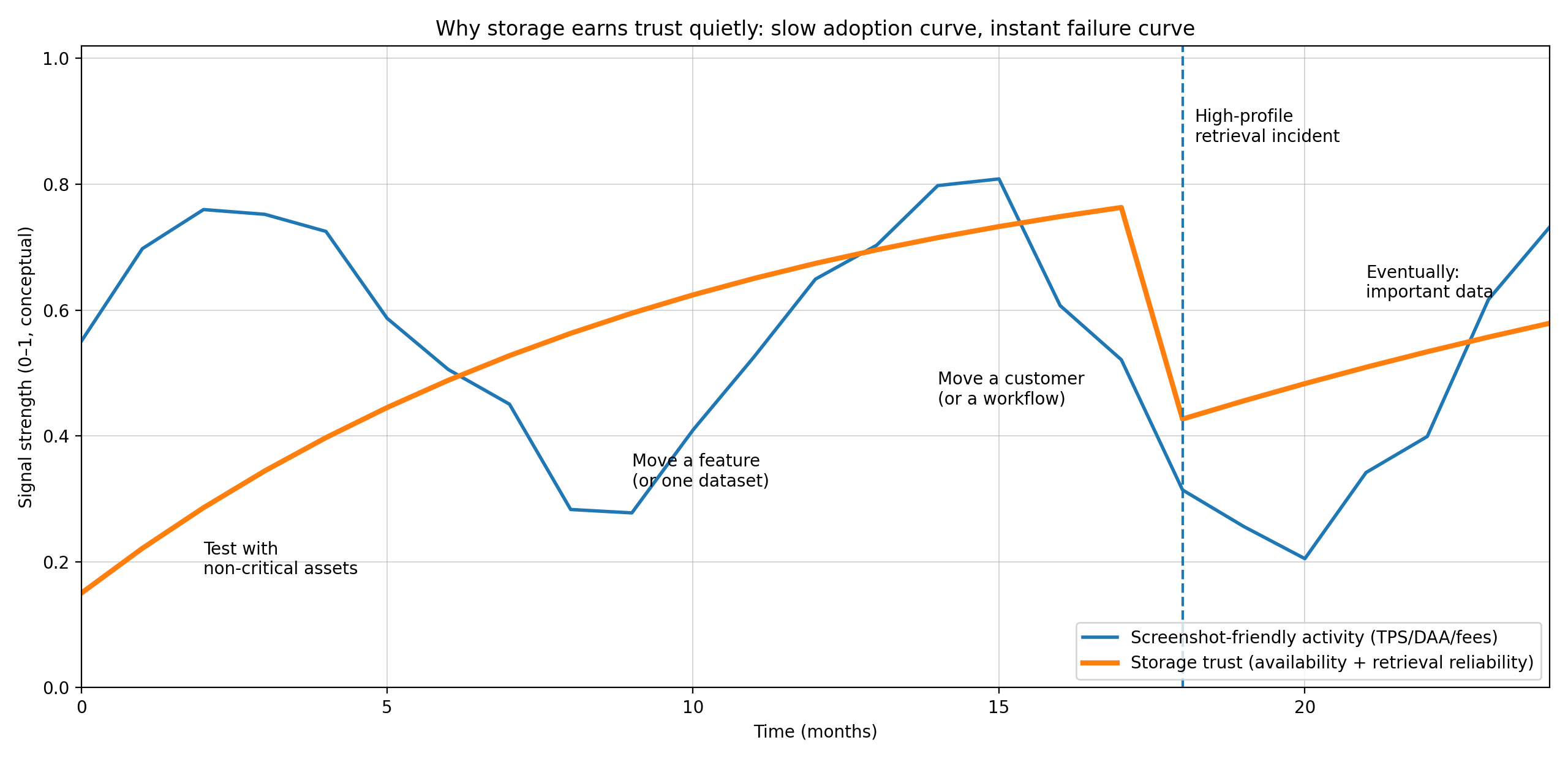 這種框架很重要,因爲存儲的承諾比計算更難兌現。計算即使在不做重要事情時也可以看起來很忙。你可以生成活動,鼓勵垃圾郵件,或者優化合成基準。存儲則不那麼寬容。如果一個網絡在“我們稍後會獲取”中虛張聲勢,而“稍後”從未到來,這將是不可行的。信任曲線是緩慢的:團隊用非關鍵資產進行測試,然後轉移一個功能,然後可能是一個客戶,最終是一些重要的東西。失敗曲線是瞬時的:一次高調的停機,一次檢索事件破壞了信心,遷移敘事一夜之間逆轉。這種不對稱性是存儲協議在嚴肅時傾向於感到保守的原因。