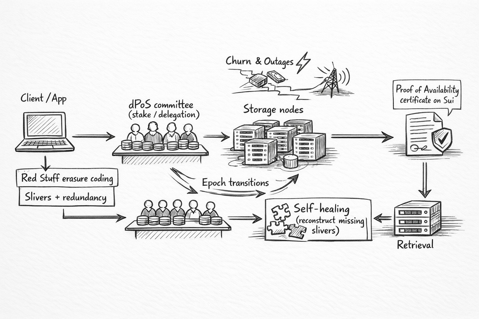 這很重要,因爲存儲故障模式是痛苦的普通。操作員更替並不是一個反派故事;它是經濟學和疲勞。某人的服務器賬單上升,託管提供商發生事件,一個團隊旋轉優先事項,一個區域出現連接問題,一個電源事件導致設備故障。有時是平凡的錯誤配置。有時是惡意操作員在看看是否可以在不做工作的情況下收集獎勵。一個假設穩定行爲的存儲網絡是一個最終會讓你失望的存儲網絡。更誠實的方法是將日常混亂視爲基線,並建立不需要英雄行爲或完美協調的恢復路徑。Walrus 的研究描述了旨在通過更替保持可用性並防止對手利用網絡延遲通過可用性檢查而不實際存儲數據的機制。
