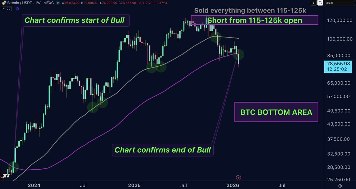 總之,我目前的觀點非常明確:BTC正處於熊市中,不是以“直接崩潰”的意義,而是有結構性的下降階段,伴隨着休整,然後繼續前行。目前發生的事情正在確認115–125k區域的判斷,即週期頂點已經形成。