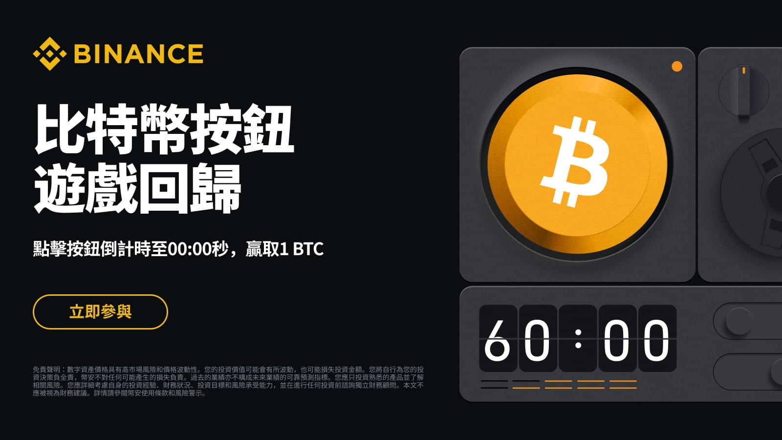 幣安將為社區再次推出比特幣按鈕遊戲。首位把計時器倒計時至00:00秒的用戶,即可贏取 1 BTC!